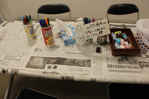 「游書道指南」さんは、会議室にて筆ペンを使って名刺や名札を作るワークショップを行っていらっしゃいました。自由に書き込みができるスペースも設けられており、来月5月にちなんだこいのぼりやカーネーション、柏餅などブースに来た方が思い思いにイラストを描いていました。